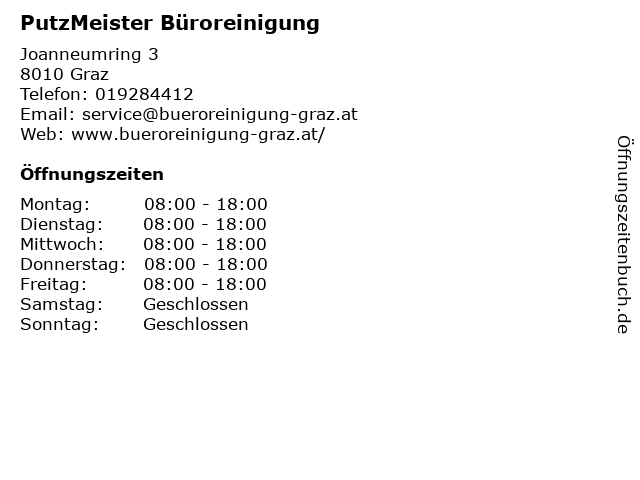 | Öffnungszeiten PutzMeister Büroreinigung in Graz anzeigen | |