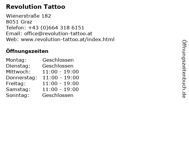 | Öffnungszeiten Revolution Tattoo in Graz anzeigen | |