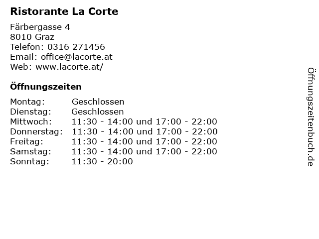 | Öffnungszeiten Ristorante La Corte in Graz anzeigen | |