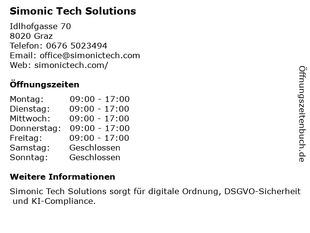 | Öffnungszeiten Simonic Tech Solutions in Graz anzeigen | |