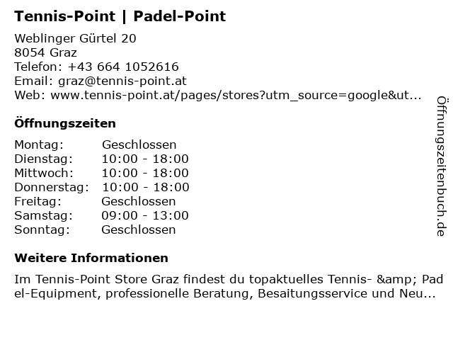 | Öffnungszeiten Tennis-Point | Padel-Point in Graz anzeigen | |