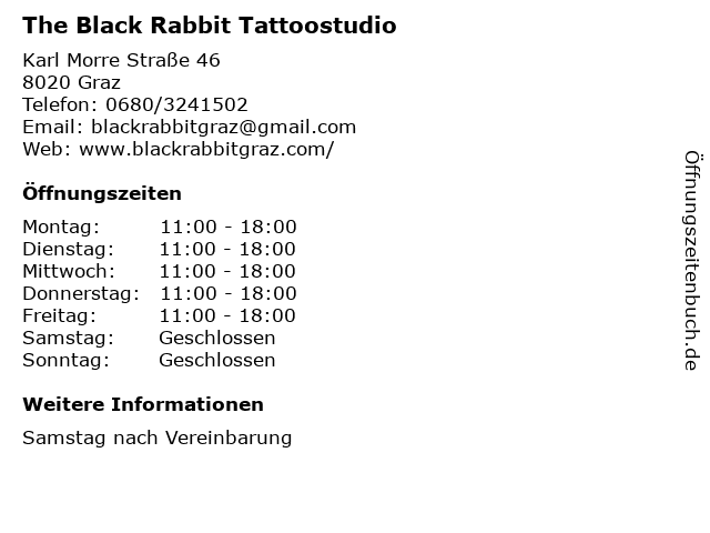 | Öffnungszeiten The Black Rabbit Tattoostudio in Graz anzeigen | |