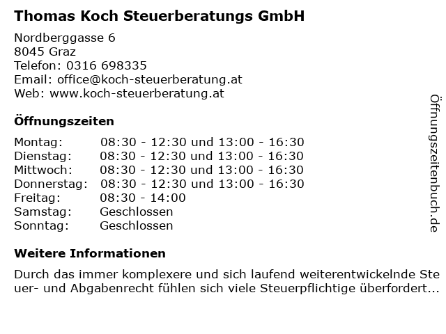 | Öffnungszeiten Thomas Koch Steuerberatungs GmbH in Graz anzeigen | |
