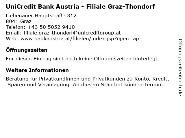 | UniCredit Bank Austria - Filiale Graz-Thondorf anrufen | |