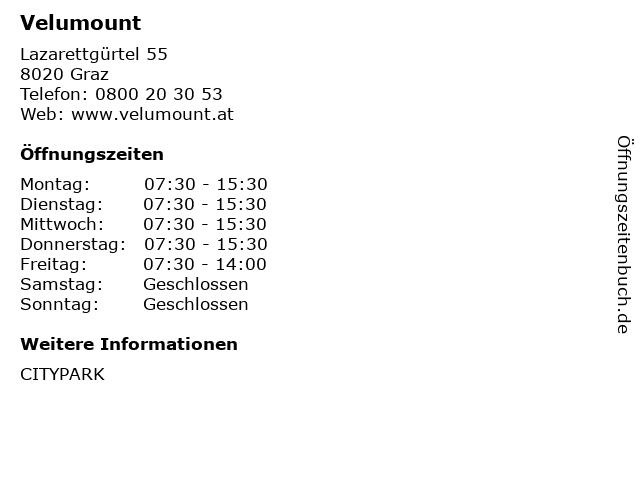 | Öffnungszeiten Velumount in Graz anzeigen | |