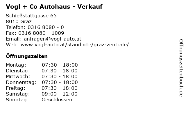 | Öffnungszeiten Vogl + Co Autohaus - Verkauf in Graz anzeigen | |