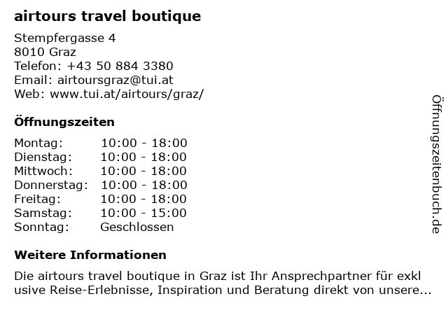 | Öffnungszeiten airtours travel boutique in Graz anzeigen | |