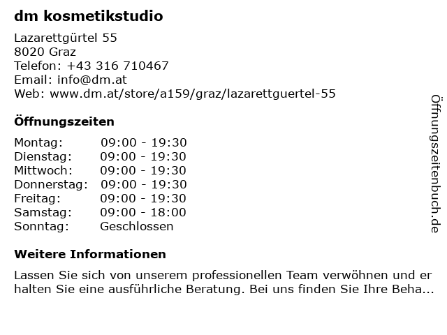 | Öffnungszeiten dm kosmetikstudio in Graz anzeigen | |