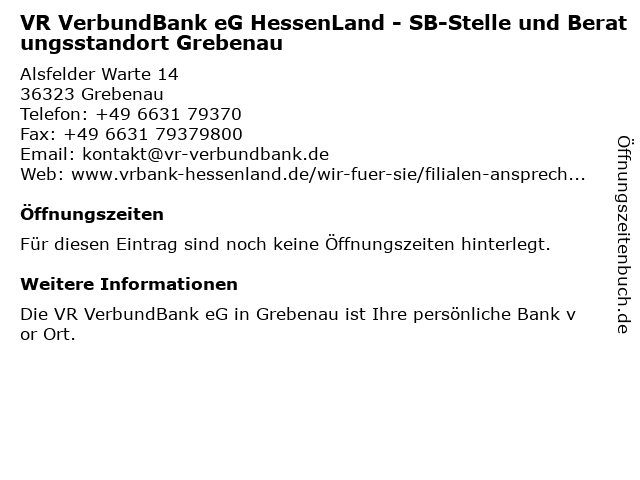 | VR VerbundBank eG HessenLand - SB-Stelle und Beratungsstandort Grebenau anrufen | |