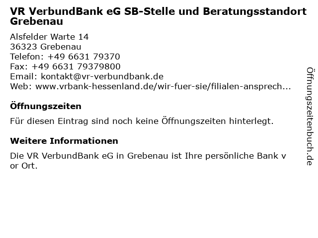 | VR VerbundBank eG SB-Stelle und Beratungsstandort Grebenau anrufen | |