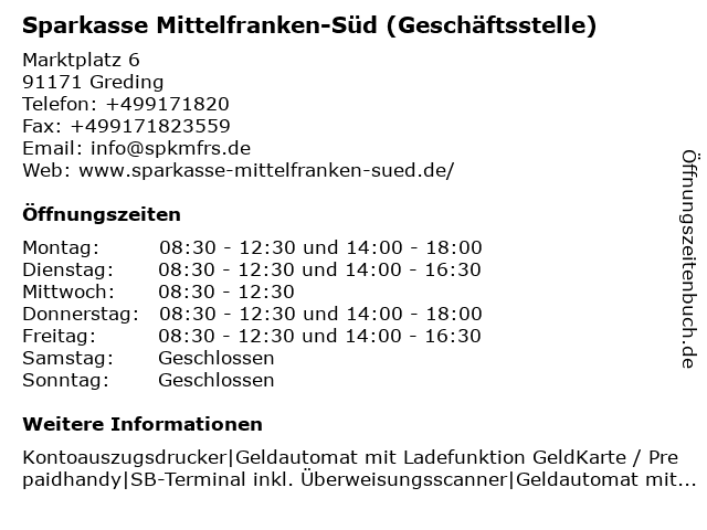 1 Sparkasse Mittelfranken-Süd (Beratungscenter) (Entfernung: 19,67 km) Christoph-Sturm-Straße 25-29, 91161 Hilpoltstein 6 |