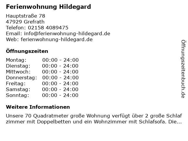| Öffnungszeiten Ferienwohnung Hildegard in Grefrath anzeigen | |