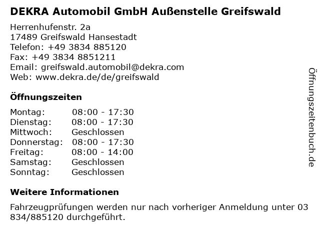 3 SSH Greifswald | Kfz-Sachverständige ATM-expert (Entfernung: 0,42 km) An den Bäckerwiesen 1, 17489 Greifswald 4 Ing.-Büro U. Possin KFZ-Gutachter / Kfz-Sachverständiger / Greifswald (Entfernung: 4,52 km) Theodor-Körner-Str. 19 D, 17498 Neuenkirchen-Greifswald 6 DEKRA Automobil Außenstelle Anklam (Fahrzeugprüfungen) (Entfernung: 31,37 km) Spantekower Landstr. 35, 17389 Anklam |