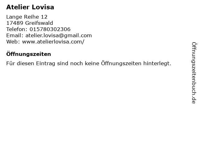 | Öffnungszeiten Atelier Lovisa in Greifswald anzeigen | |
