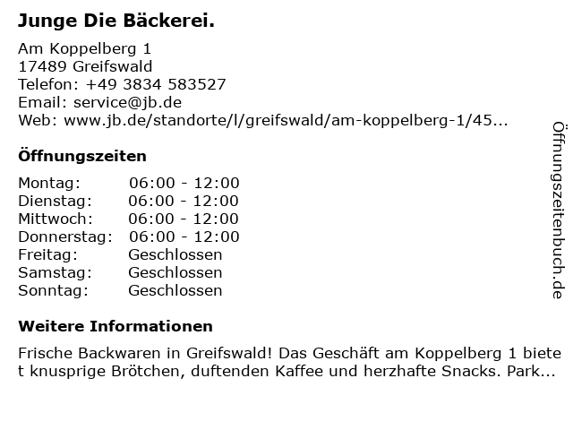 | Öffnungszeiten Junge Die Bäckerei. in Greifswald anzeigen | |