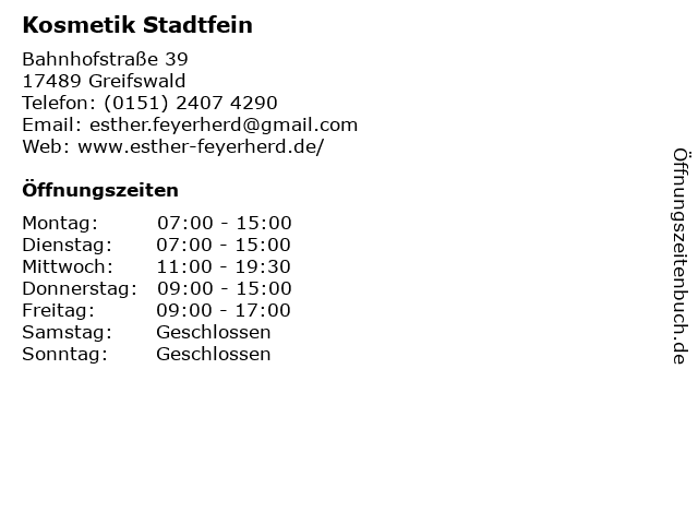 | Öffnungszeiten Kosmetik Stadtfein in Greifswald anzeigen | |