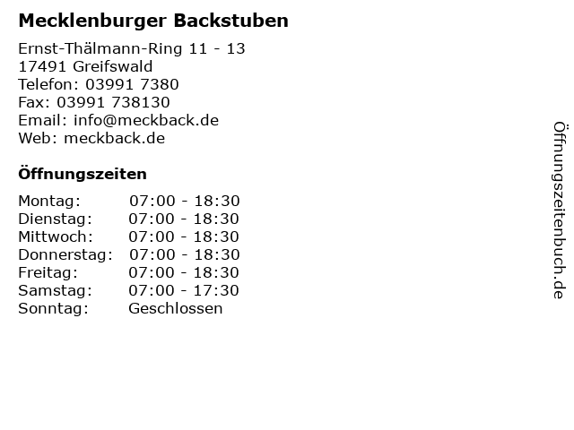 | Öffnungszeiten Mecklenburger Backstuben in Greifswald anzeigen | |