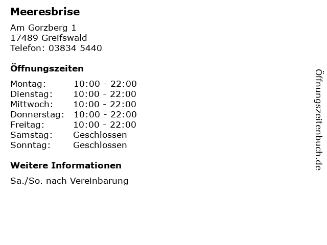 | Öffnungszeiten Meeresbrise in Greifswald anzeigen | |