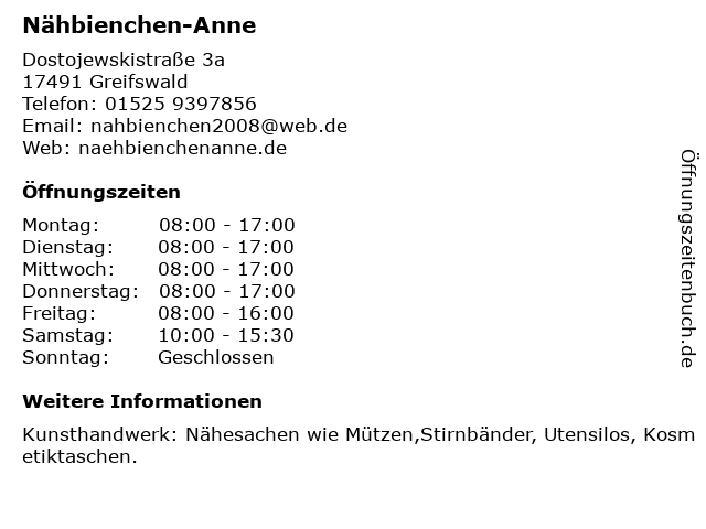 | Öffnungszeiten Nähbienchen-Anne in Greifswald anzeigen | |