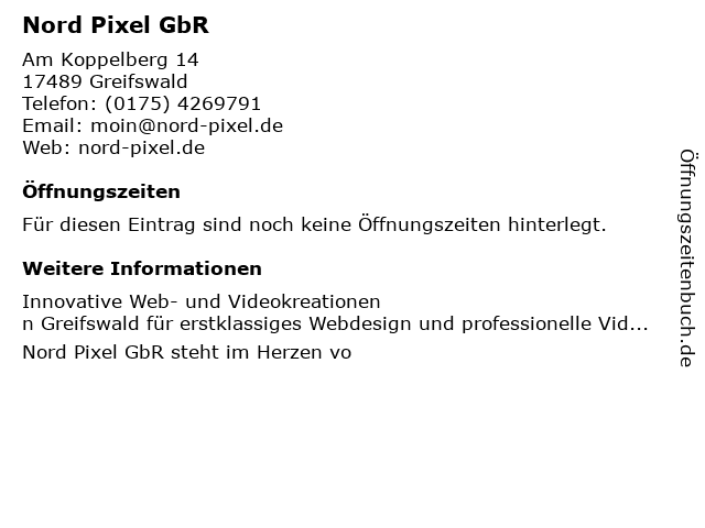 | Öffnungszeiten Nord Pixel GbR in Greifswald anzeigen | |