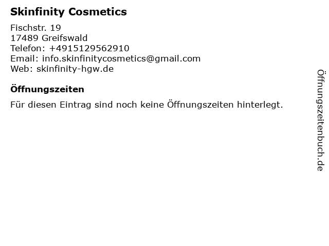 | Öffnungszeiten Skinfinity Cosmetics in Greifswald anzeigen | |