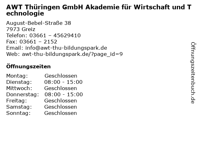 Branchen & Suchbegriffe zu AWT Thüringen GmbH Akademie für Wirtschaft und Technologie:akademie, ausbildung, awt, förderung, integration, kurse, lehrgänge, technologie, thüringen, wirtschaft |