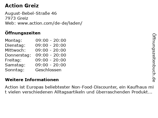 | Öffnungszeiten Action Greiz in Greiz anzeigen | |