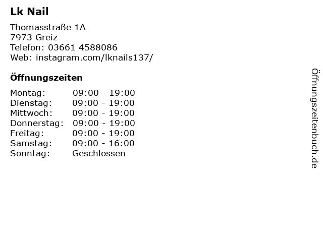 | Öffnungszeiten Lk Nail in Greiz anzeigen | |