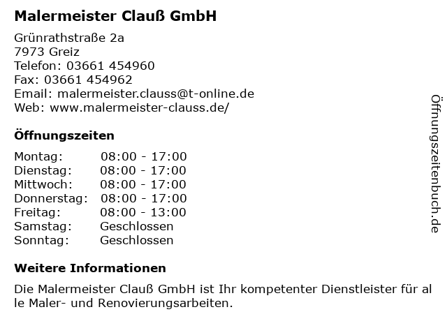 | Öffnungszeiten Malermeister Clauß GmbH in Greiz anzeigen | |