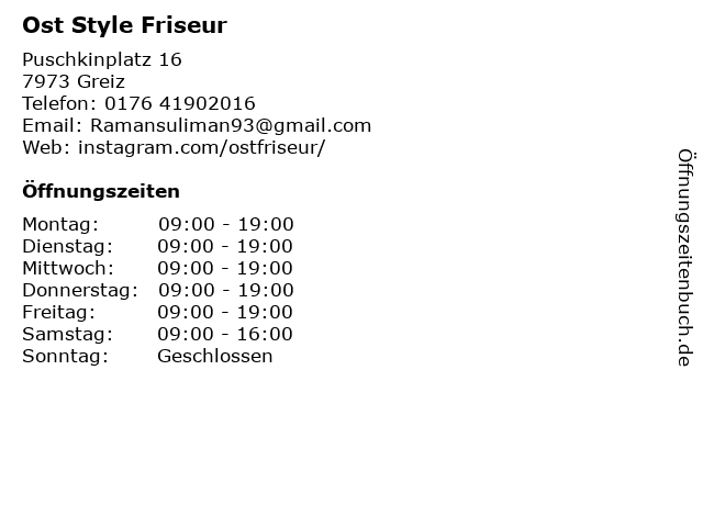 | Öffnungszeiten Ost Style Friseur in Greiz anzeigen | |