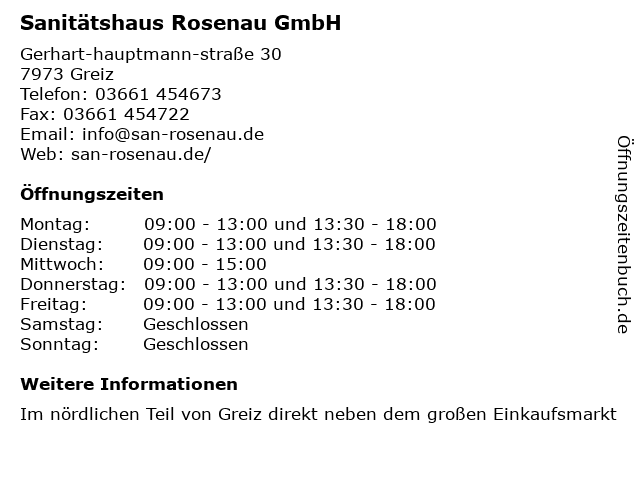 | Öffnungszeiten Sanitätshaus Rosenau GmbH in Greiz anzeigen | |