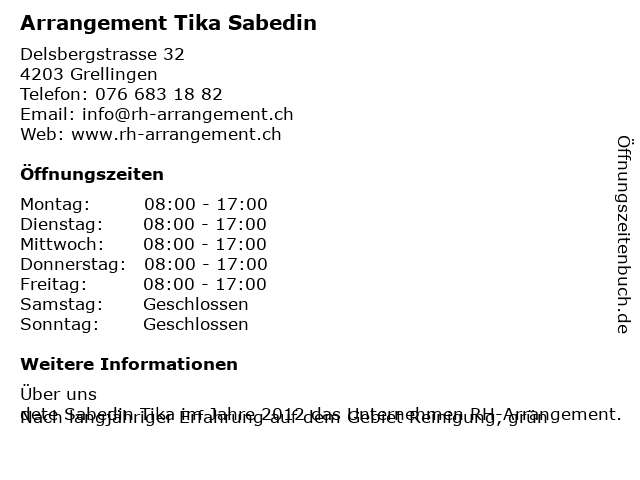 | Öffnungszeiten Arrangement Tika Sabedin in Grellingen anzeigen | |