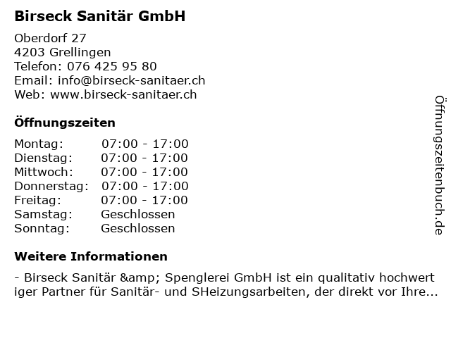 | Öffnungszeiten Birseck Sanitär GmbH in Grellingen anzeigen | |