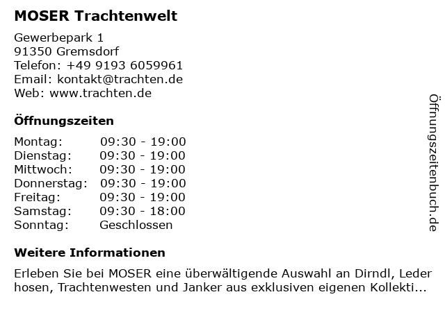| Öffnungszeiten MOSER Trachtenwelt in Gremsdorf anzeigen | |