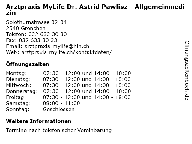 | Montag | 07:30-12:00 und 14:00-18:00 |