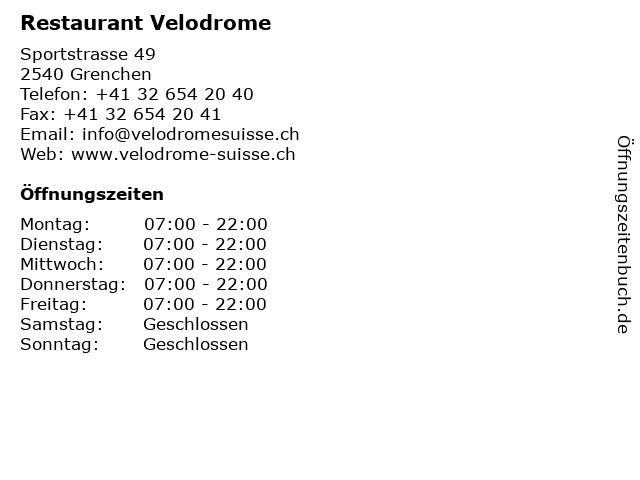 | Öffnungszeiten Restaurant Velodrome in Grenchen anzeigen | |