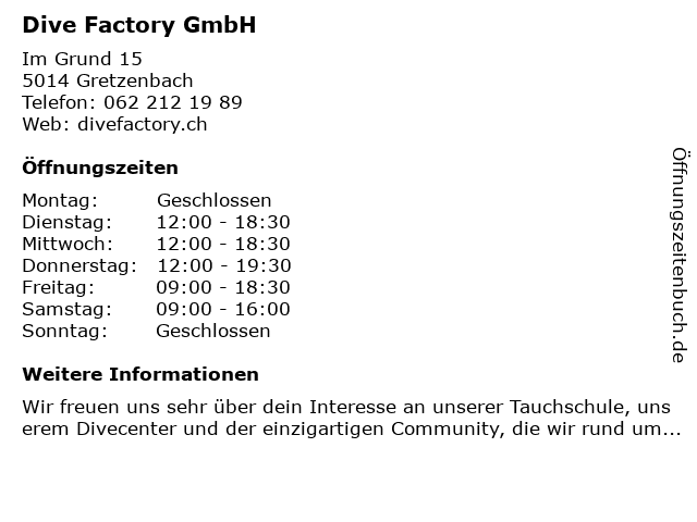 | Öffnungszeiten Dive Factory GmbH in Gretzenbach anzeigen | |