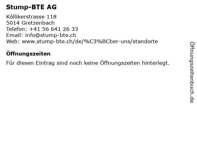 | Öffnungszeiten Stump-BTE AG in Gretzenbach anzeigen | |
