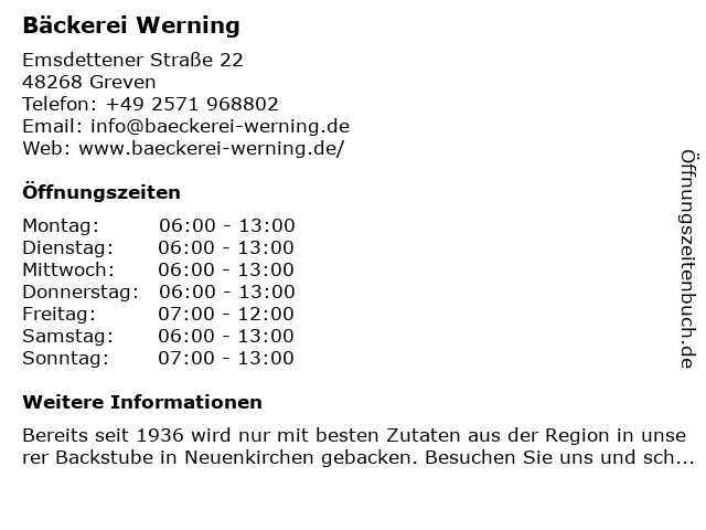 | Öffnungszeiten Bäckerei Werning in Greven anzeigen | |