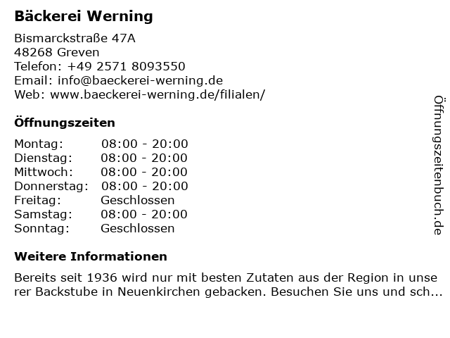 | Öffnungszeiten Bäckerei Werning in Greven anzeigen | |