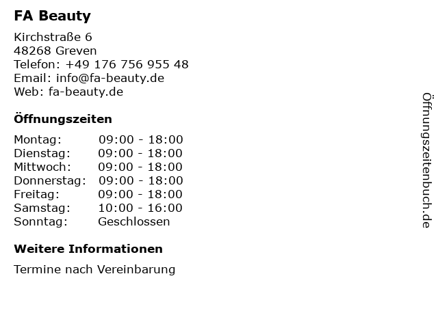 | Öffnungszeiten FA Beauty in Greven anzeigen | |