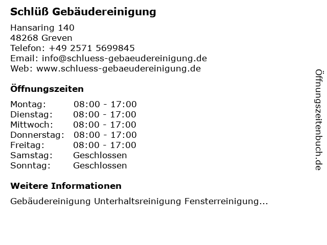 | Öffnungszeiten Schlüß Gebäudereinigung in Greven anzeigen | |