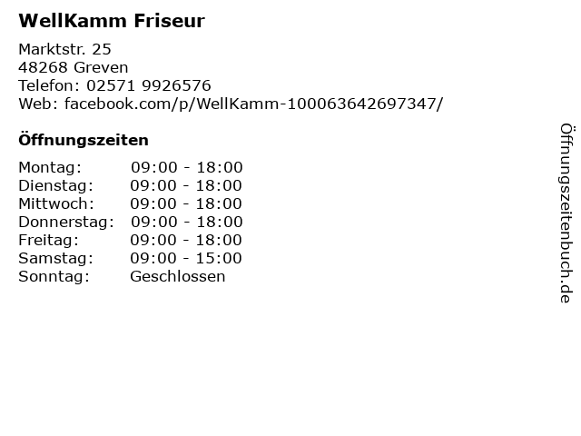 | Öffnungszeiten WellKamm Friseur in Greven anzeigen | |