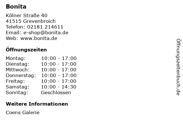 | Öffnungszeiten Bonita in Grevenbroich anzeigen | |