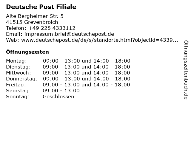 | Öffnungszeiten Deutsche Post Filiale in Grevenbroich anzeigen | |