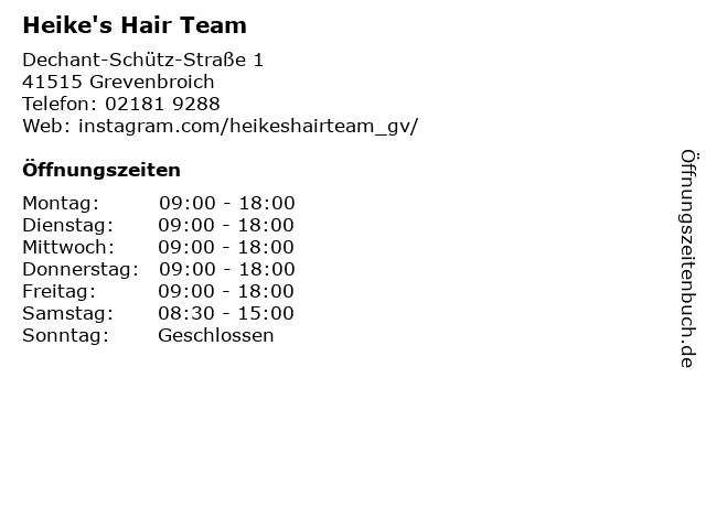 | Öffnungszeiten Heike's Hair Team in Grevenbroich anzeigen | |