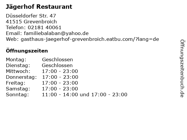 | Öffnungszeiten Jägerhof Restaurant in Grevenbroich anzeigen | |
