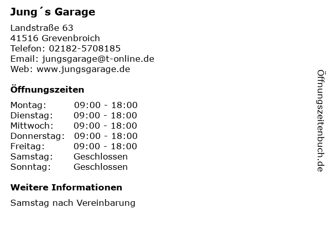 | Öffnungszeiten Jung´s Garage in Grevenbroich anzeigen | |