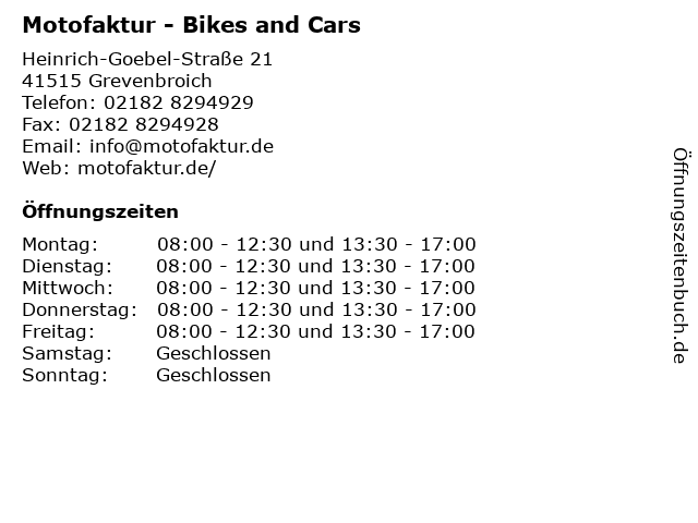 Branchen & Suchbegriffe zu Motofaktur - Bikes and Cars:achsvermessung, and, bikes, cars, fahrzeugdiagnose, inspektion, klimaservice, motofaktur, reifenservice, reparatur, unfallservice, wartung, ölwechsel |