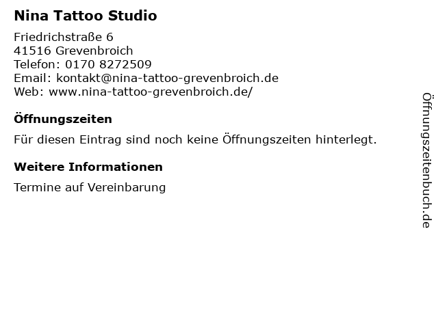 | Öffnungszeiten Nina Tattoo Studio in Grevenbroich anzeigen | |